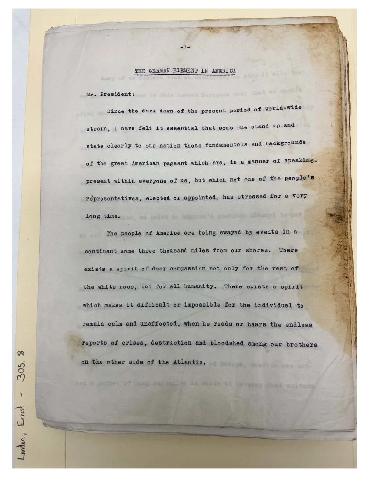 Quote from "The German Element in America" Speech, Senator Lundeen was meant to give. 1940.