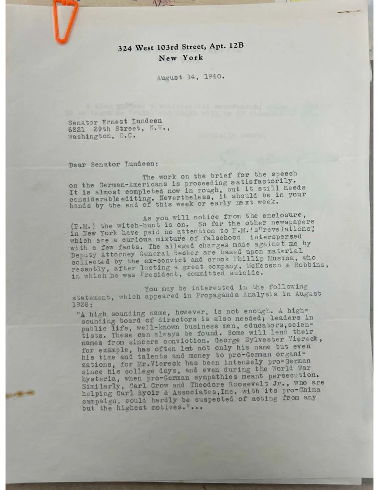 Lundeen received a letter from Viereck on August 14, 1940, telling him to not worry about being exposed by the media. That it was "a witch hunt". The letter also detailed the "German American" speech that was in the works, being ghost written by George Viereck. This was "The German Element in America" speech that Lundeen was to give weeks later.